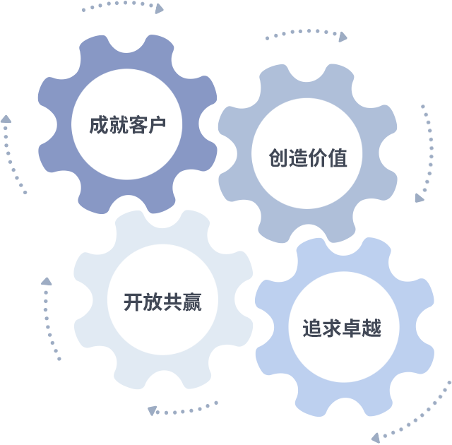 成就客户是一切决策的出发点,创造价值是衡量所有工作的标准,追求卓越是龙虎国际做事做人的态度,开放共赢是龙虎国际的格局也是最终的结果。价值观的齿轮环环相扣,推动着组织里的每个人不断向前。